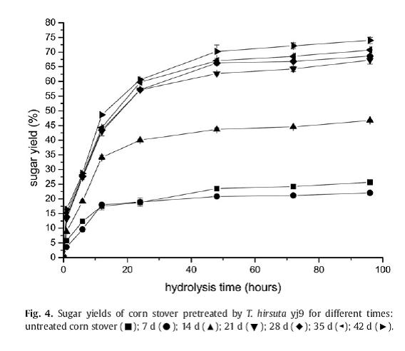 中國科學院成都生物研究所應用與環境微生物研究中心劉曉風課題組采用高效菌株——毛栓菌(Trametes hirsute) Y9,對玉米秸稈進行了預處理研究。結果表明,進過42天的處理,木質素降解到達71.49%,處理后的原料酶解率到達了73.99%。對預處理后的原料電鏡掃描后發現,預處理后的秸稈表面變得粗糙、纖維素纖維之間的空隙清晰可見,并且形成許多孔狀。